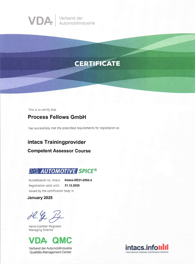 Among other things, we are allowed to train Automotive SPICE® assessors and to conduct intacs® trainings.