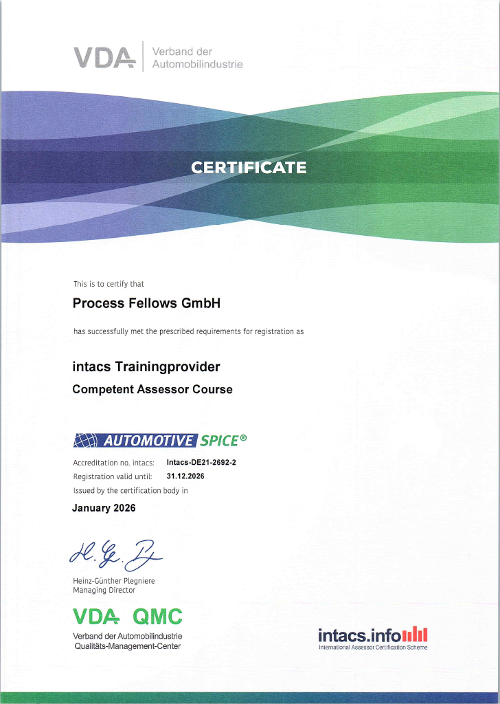 Wir dürfen damit unter anderem Automotive SPICE® Assessoren ausbilden und zertifizierte intacs® Trainings durchführen.